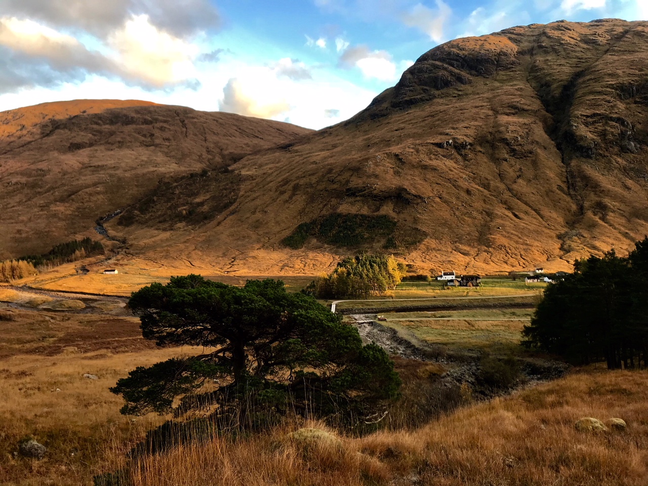 We’d driven in through sheets of rain and hills white with water, we drove out four days later through folds of gold and amber. It was a wrench as the group said their goodbyes. Later, after tidying the houses, collecting the laundry and chatting through the past few days, Alasdair and I walked to the Scots pine trees up on the side of Beinn nan Aighenan. Through the tangle of red-pink branches I watched the last of the afternoon sun slide across the Stalker’s House, the Lodge, the deer larder, the sheds, the hill park, the Shepherd’s Bothy. I felt the group’s absence as a new bright presence in this place.